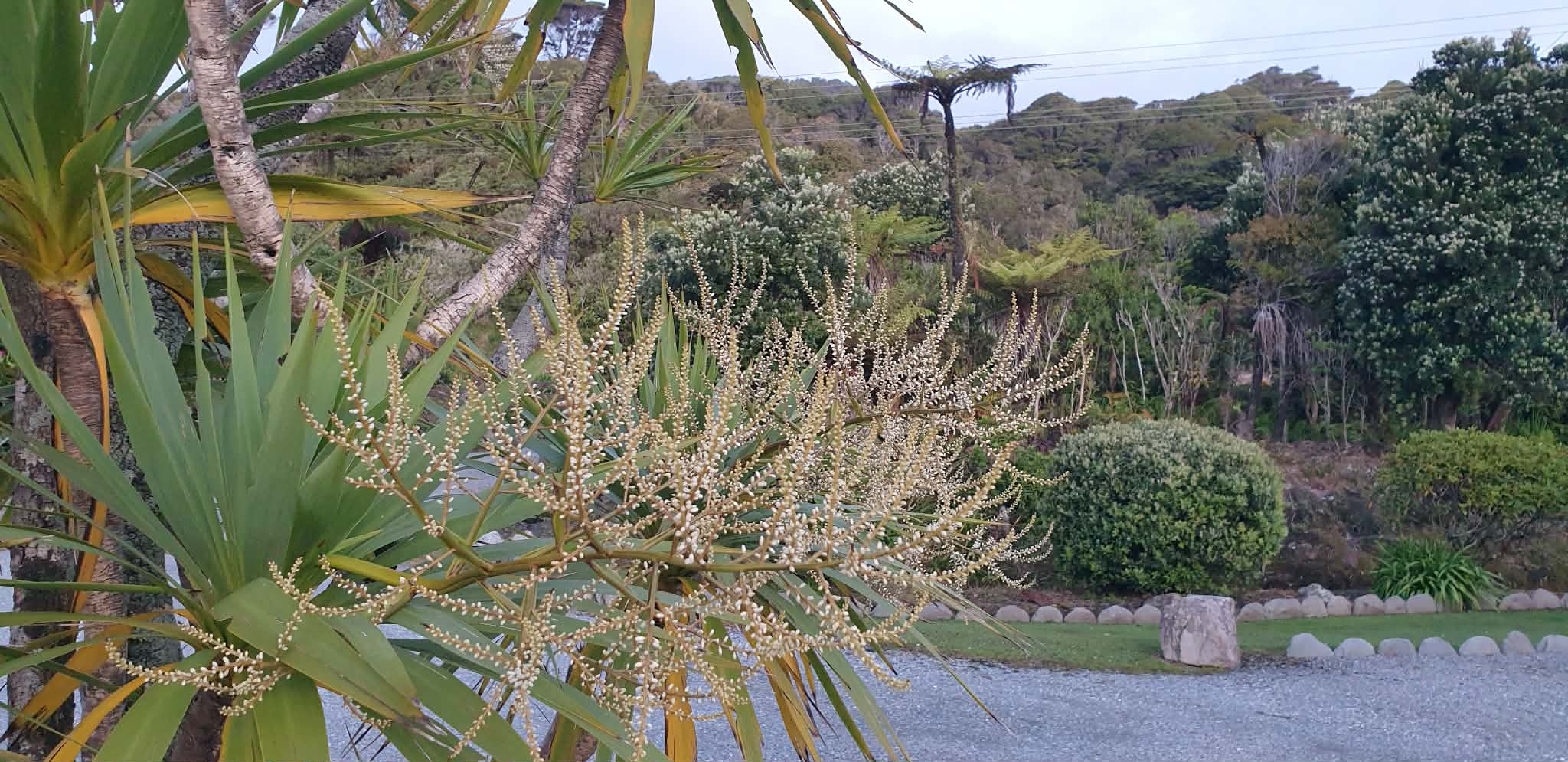 A supposed sure sign of a good summer ahead is the cabbage tree in flower. We have one in our drive entrance and one down in the garden on the way to the beach track. Both have been laden with flowers at the end of Spring. Unfortunately some strong winds have whipped most of the blossom off the flower frongs (I don’t know… is that what’d you call them….., I think I’ve made that word up but it sounds good……). But they are still looking pretty and I’m holding to that adage for our upcoming summer.